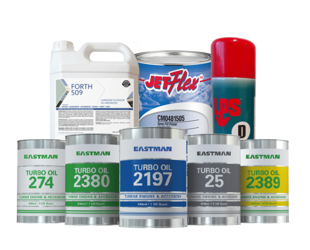 Óleos sintéticos para motores de turbina, com alta resistência térmica.